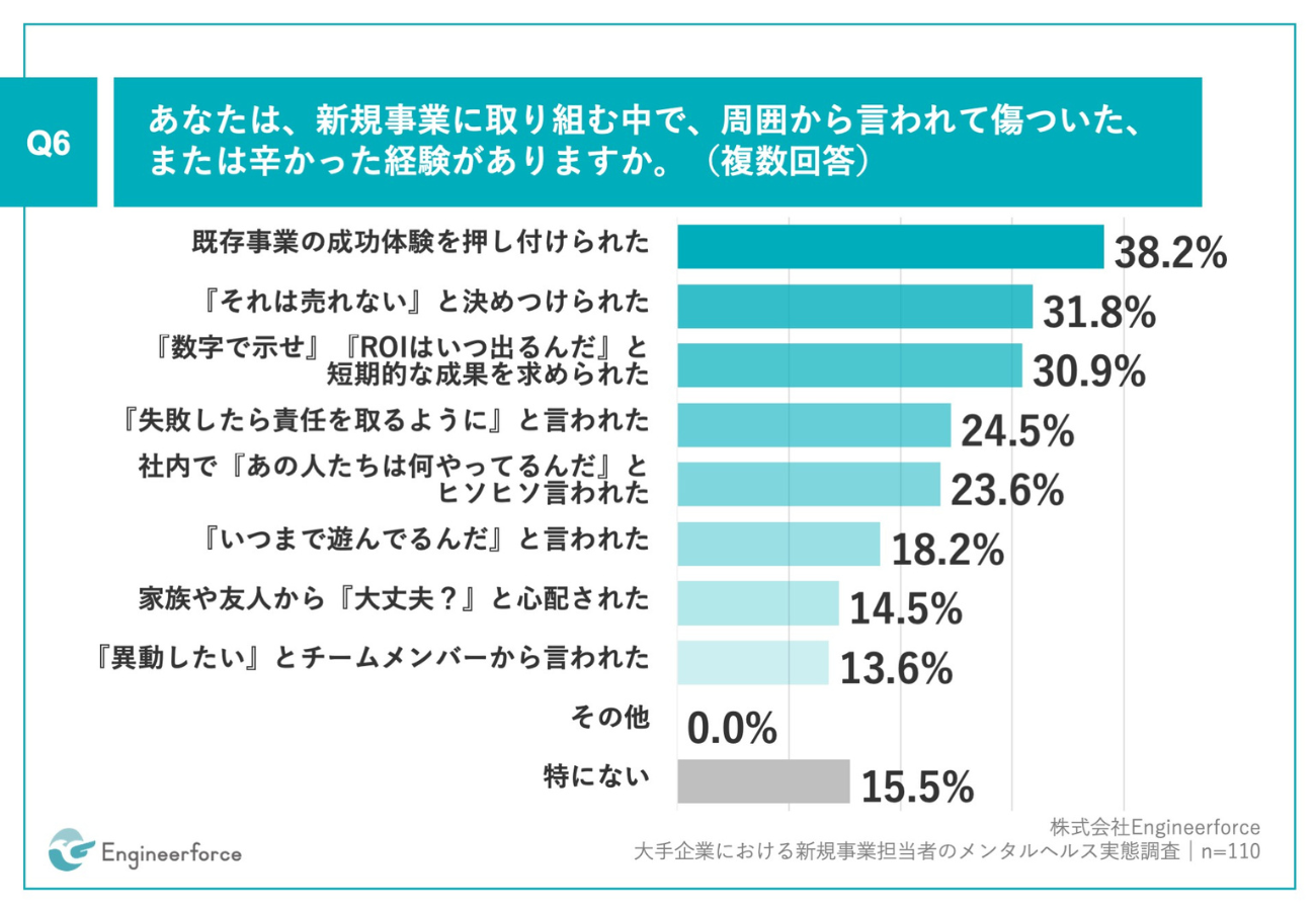 「Q6.あなたは、新規事業に取り組む中で、周囲から言われて傷ついた、または辛かった経験がありますか。(複数回答)」(n=110)と質問したところ、「既存事業の成功体験を押し付けられた」が38.2%、「『それは売れない』と決めつけられた」が31.8%、「『数字で示せ』『ROIはいつ出るんだ』と短期的な成果を求められた」が30.9%となった。