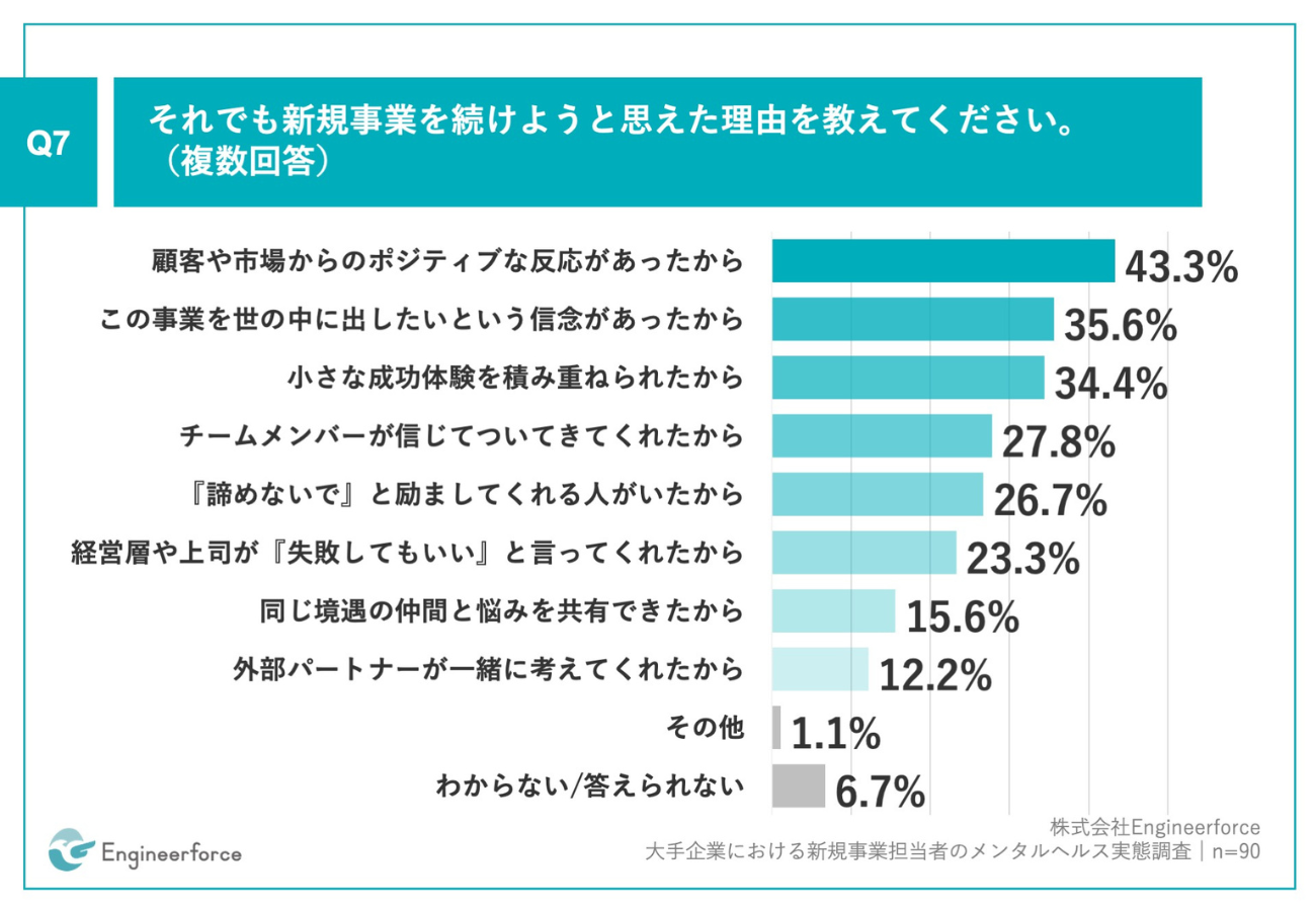 Q4で「何度もあった」「数回あった」「1回だけあった」と回答した人に、「Q7.それでも新規事業を続けようと思えた理由を教えてください。(複数回答)」(n=90)と質問したところ、「顧客や市場からのポジティブな反応があったから」が43.3%と最多。「この事業を世の中に出したいという信念があったから」が35.6%、「小さな成功体験を積み重ねられたから」が34.4%となった。