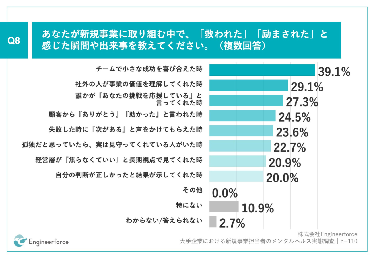 「Q8.あなたが新規事業に取り組む中で、「救われた」「励まされた」と感じた瞬間や出来事を教えてください。(複数回答)」(n=110)と質問したところ、「チームで小さな成功を喜び合えた時」が39.1%、「社外の人が事業の価値を理解してくれた時」が29.1%、「誰かが『あなたの挑戦を応援している』と言ってくれた時」が27.3%となった。