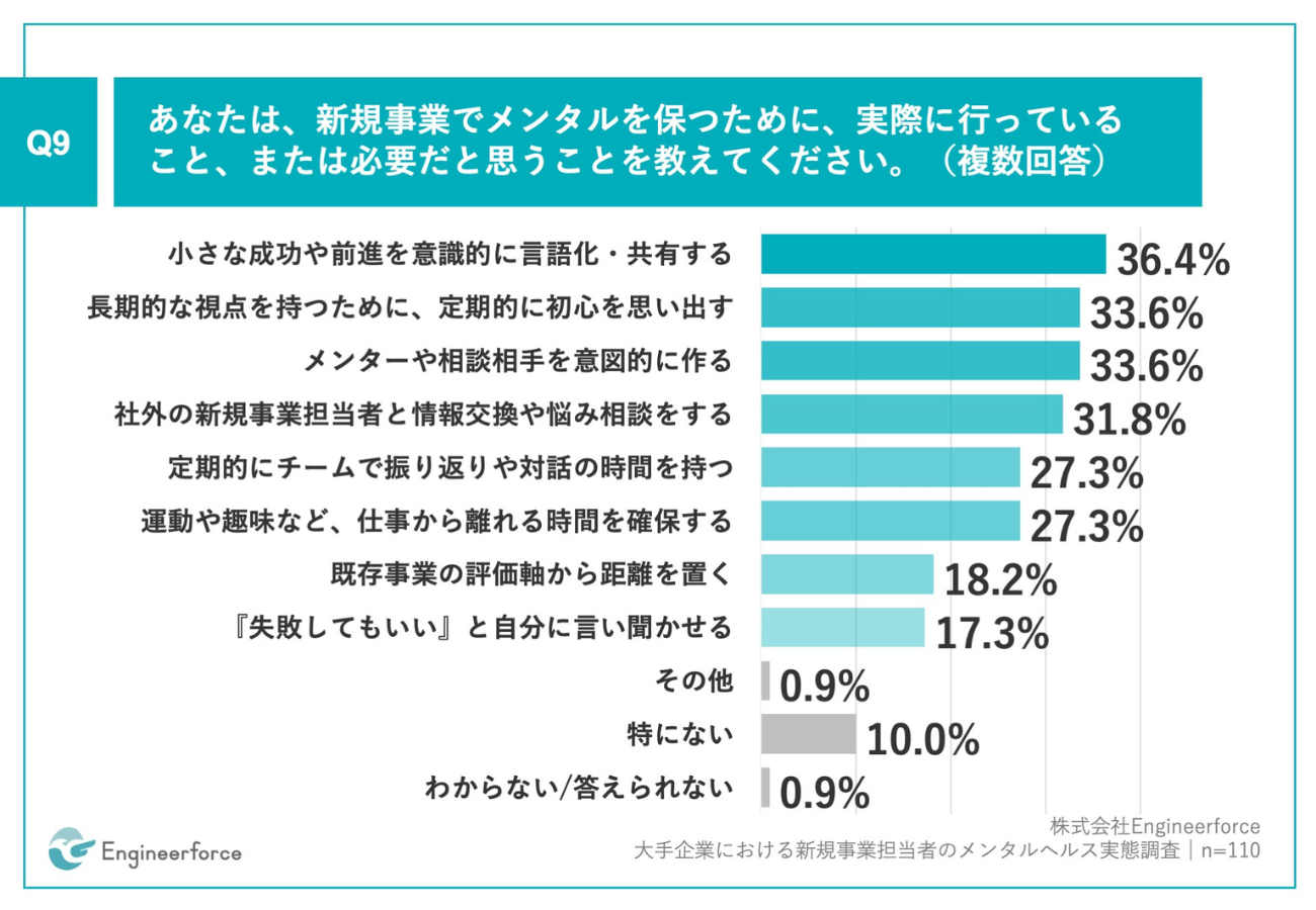 「Q9.あなたは、新規事業でメンタルを保つために、実際に行っていること、または必要だと思うことを教えてください。(複数回答)」(n=110)と質問したところ、「小さな成功や前進を意識的に言語化・共有する」が36.4%、「長期的な視点を持つために、定期的に初心を思い出す」が33.6%、「メンターや相談相手を意図的に作る」が33.6%となった。