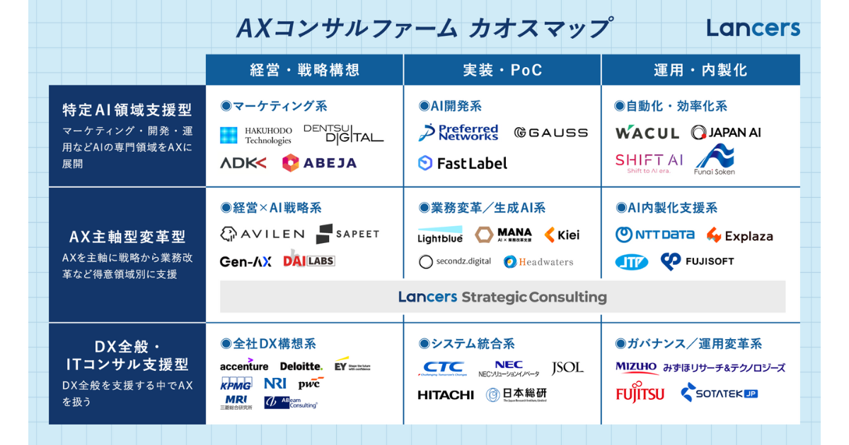 今回公開されたカオスマップは、横軸を「特定AI領域支援型」「AX主軸型変革型」「DX全般・ITコンサル支援型」という支援スタイル、縦軸を「経営・戦略構想」「実装・PoC」「運用・内製化」の3つの変革プロセスで区分している。これにより、企業経営層がAI活用の全体像を把握し、自社の課題や進捗に合うコンサル企業を選定しやすい構成となっている。