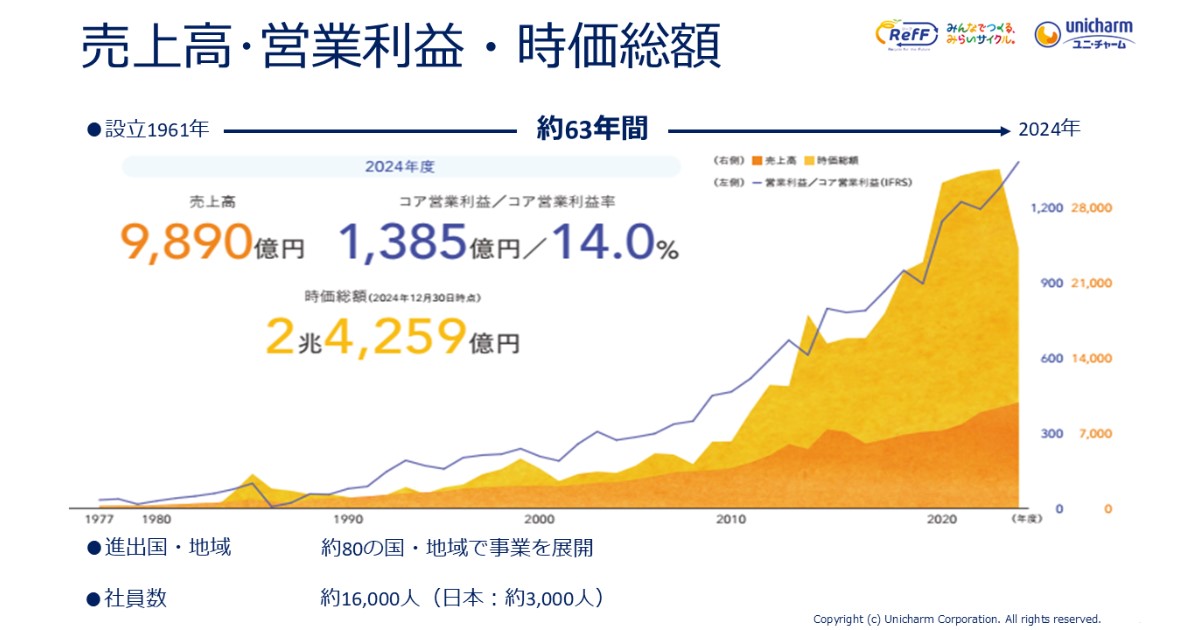 多田:当社の成長スピードは非常に速く、2023年には海外売上比率が約66%に達しました。2007年時点では国内売上が3分の2を占めていましたが、現在は完全に逆転しています。ベビーケア、フェミニンケア、ウェルネスケア、ペットケアといった各カテゴリーでアジア市場を中心に高いシェアを誇っており、2024年は時価総額約2兆4,259億円規模、売上高9,890億円、コア営業利益1,385億円と優良な財務体質を維持しています。