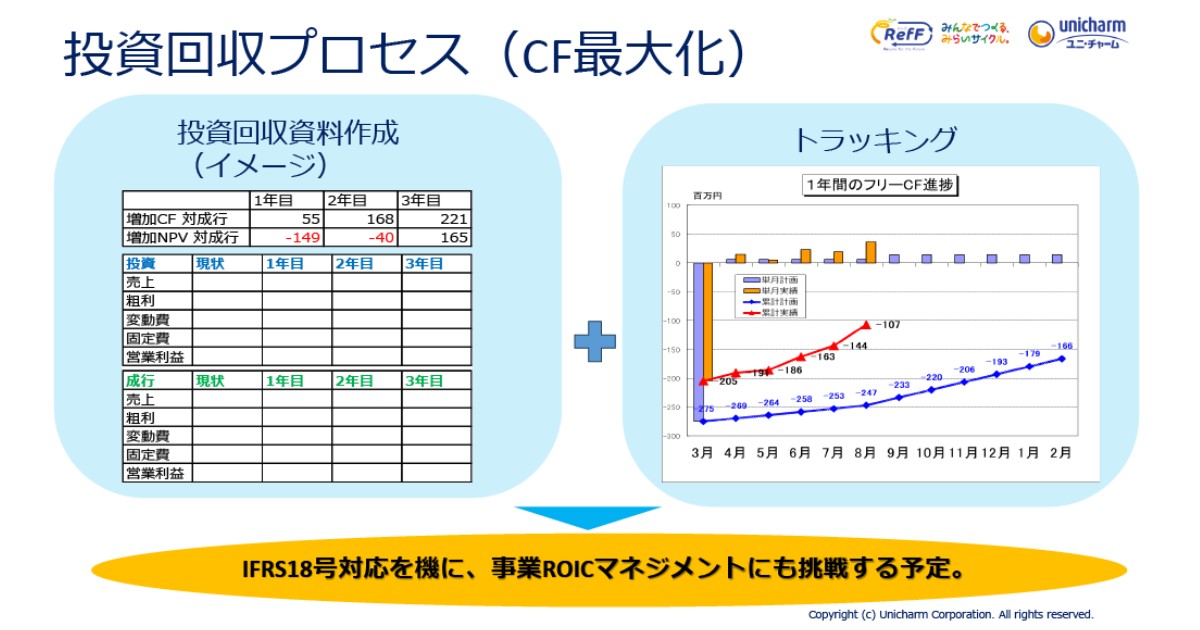 また、「投下資本回収管理」においても、単なるキャッシュフローの予測に留まらず、事業ごとにROIC(投下資本利益率)の視点を取り入れ、マーケティング投資や設備投資が本当に価値を生んでいるかを厳しくモニタリングする準備を進めています。