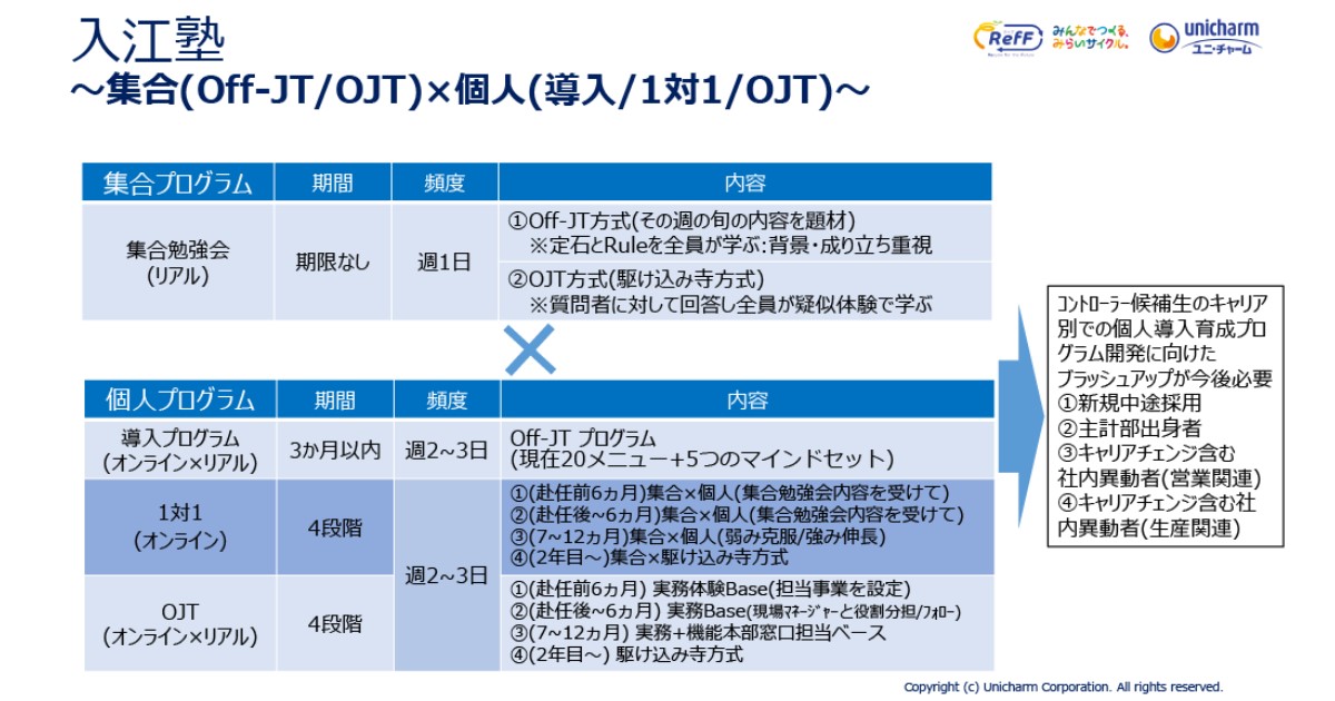 入江:30年以上培ってきた「コントローラーとして成功する勘やコツ、急所(How to)」をレシピ化し、アルゴリズム化しました。塾生は、経理未経験の営業出身者や中途採用メンバーなど多様です。彼らを半年間でプロとして各事業部へ送り出すのが私のミッションです。大きく3つの柱で運営しています。