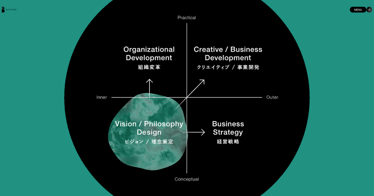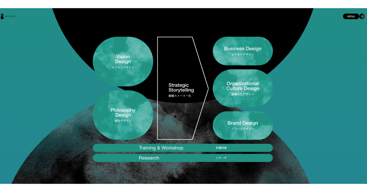 リニューアルしたコーポレートサイトは、BIOTOPEの有機的な特徴を残しつつ、強い意志を持つ硬質な要素を併せ持つデザインを採用した。「戦略デザインファーム」としての立ち位置を明確にし、同業他社との単純な比較ではなく、独自の信念や思想を軸にした価値創出を強調している。また、提供サービス全体の体系を分かりやすく図式化し、ビジョン・理念デザインを起点として経営戦略や組織変革、新規事業開発、ブランド・クリエイティブへと展開する流れを可視化している。