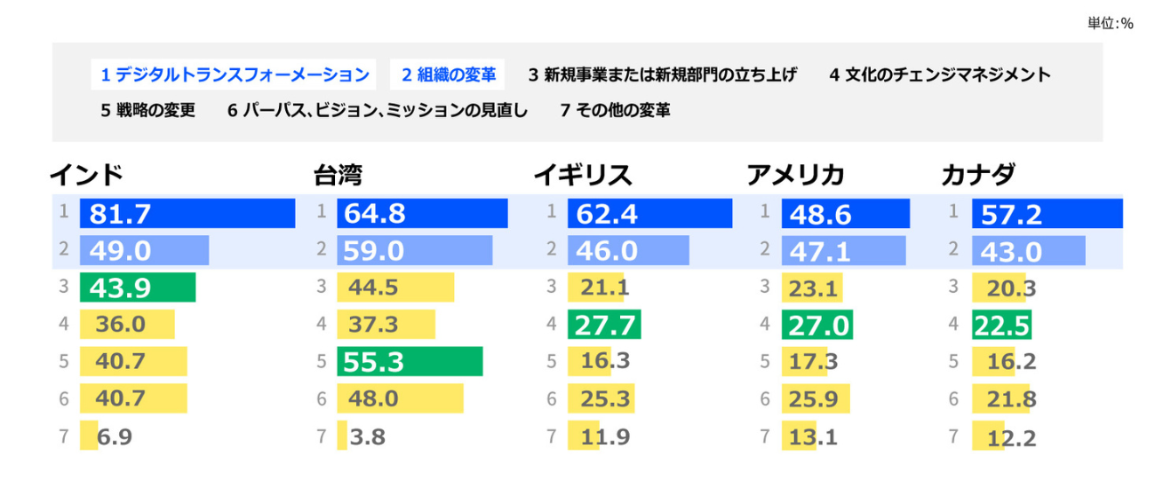 1.「デジタルトランスフォーメーション」と「組織の変革」は各市場で共通して取り組まれている。次点の取り組みは、インドでは「新規事業または新規部門の立ち上げ」、台湾では「戦略の変更」、イギリス・アメリカ・カナダでは「文化のチェンジマネジメント」と、市場によって異なる(図1)。