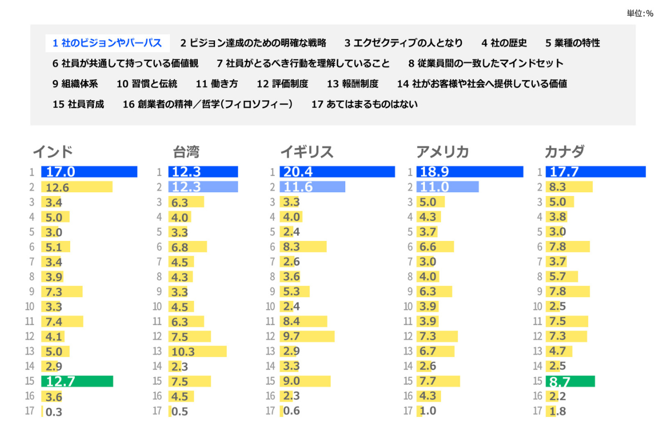 2.自社の企業文化に影響を与えた要因について、「社のビジョンやパーパス」が各市場で最も多く選択された。次点で、インド・カナダでは「社員育成」、台湾(最多同数)・イギリス・アメリカでは「ビジョン達成のための明確な戦略」が挙がった(図2)。