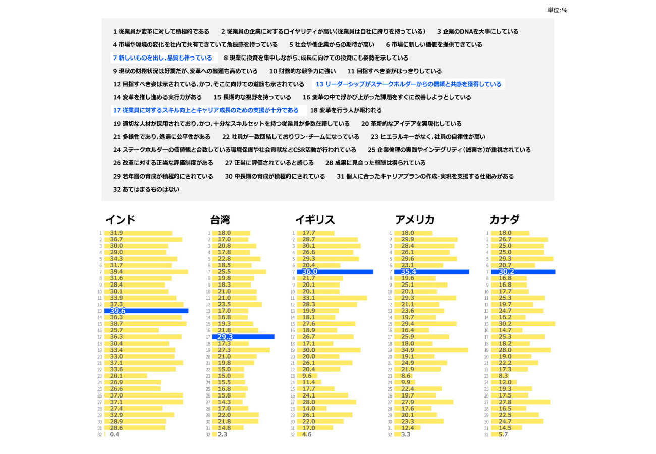 なお同社では、グローバル展開に先行し、Culture For Growthを提供予定の5市場(インド、台湾、イギリス、アメリカ、カナダ)において、変革に取り組む企業に勤務する20~59歳、計3100人を対象に、企業の変革状況および企業文化の現状を把握するための調査を実施した。