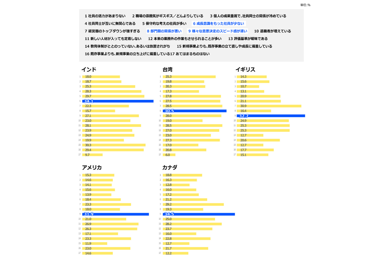 一方で、ネガティブな印象として、インドでは「成長意識をもった社員が少ない」、台湾では「部門間の関係が悪い」、アメリカ・イギリス・カナダでは「さまざまな意思決定のスピード感が遅い」が最も選択された(図4)。