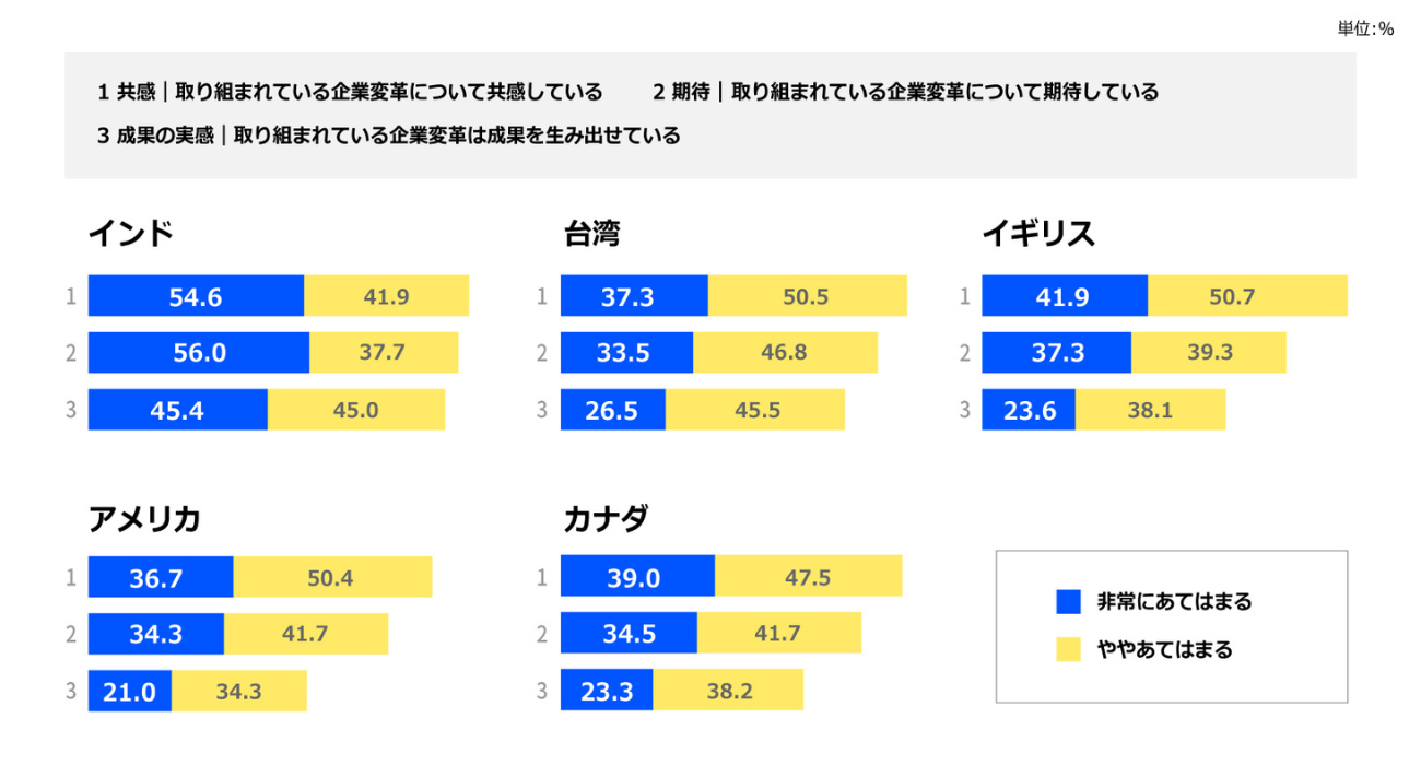 4.自社の変革に対する共感・期待・成果の実感はインドが最も高く、いずれも「非常にあてはまる」が5割ほど、肯定的な回答の合計は9割を超える。一方で、台湾・イギリス・アメリカ・カナダでは「非常にあてはまる」の割合が共感で4割ほど、期待で3割ほど、成果の実感では2割ほどにとどまり、変革の浸透度に差が見られる(図5)。