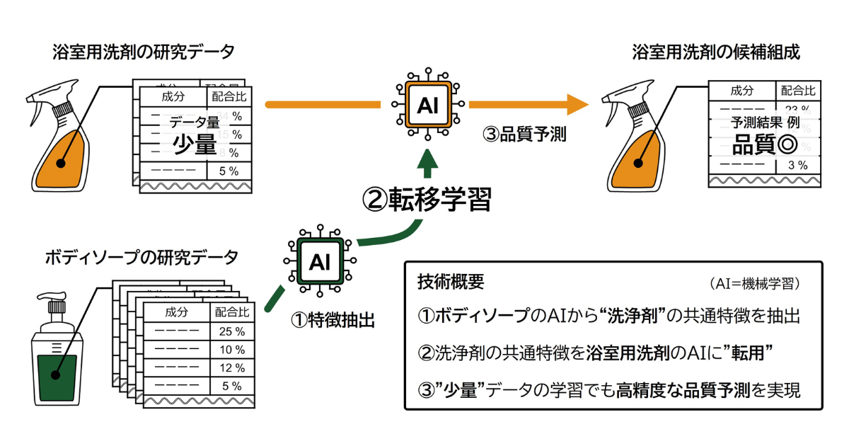 今回発表した転移学習モデルでは、過去に蓄積したボディソープの研究データを、開発が進む浴室用洗剤など、異なる製品分野の研究に応用することを可能にした。ライオン独自の特徴量生成手法を応用し、ボディソープと浴室用洗剤に共通する特徴を抽出。これを新たな機械学習モデルに組み込むことで、従来はデータ不足で精度向上が難しかった状況でも、高い予測精度を実現した。
