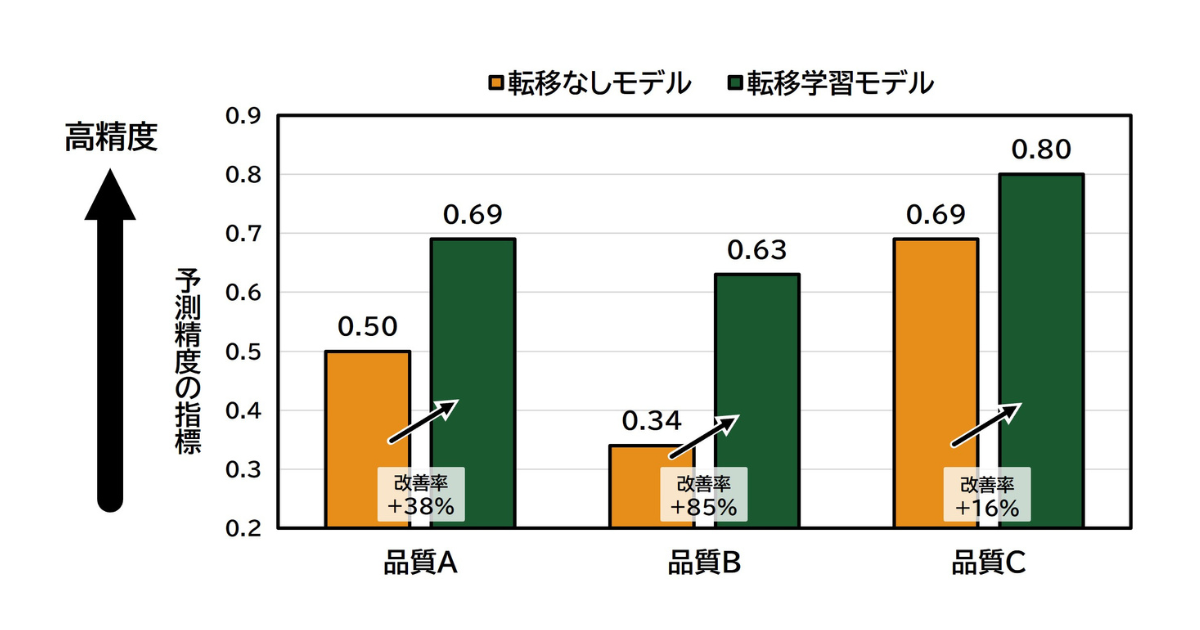 実際に浴室用洗剤の開発に本モデルを適用した結果、従来の転移なしモデルでは困難だった高精度予測が可能となり、未知の組成に対しても予測精度が高いことが確認された。加えて、実験数は従来と比較し最大約85%削減できると見込まれるため、実験・開発期間の大幅な短縮が実現する。