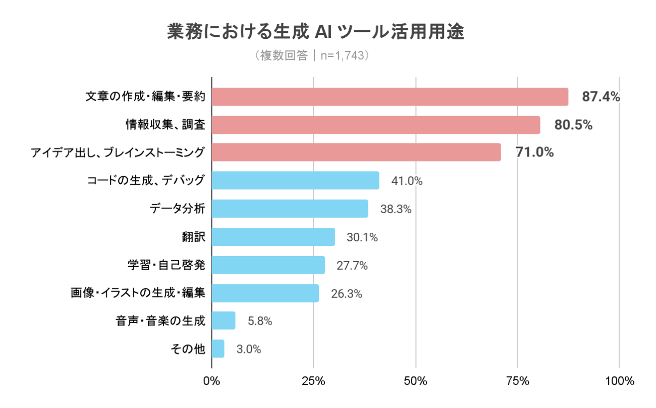AI関連講座を受講し、生成AIツールを業務利用している同コンソーシアム会員登録者1,743人に、生成AIツールの業務用途について聞いたところ、1位「文章の作成・編集・要約」87.4%、2位が「情報収集、調査」80.5%、3位が「アイデア出し、ブレインストーミング」71.0%となった。