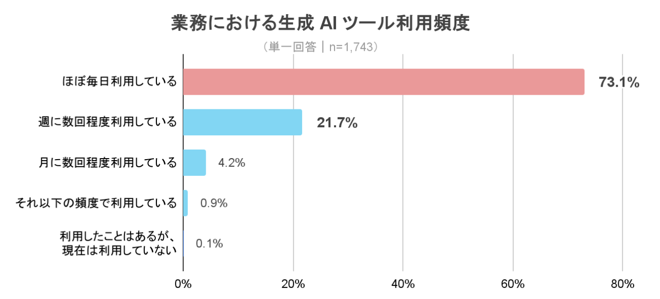 AI関連講座を受講し、生成AIツールを業務利用している同コンソーシアム会員登録者1,743人に、業務で生成AIツールを利用する頻度を聞いたところ、73.1%が「ほぼ毎日利用している」と回答した。