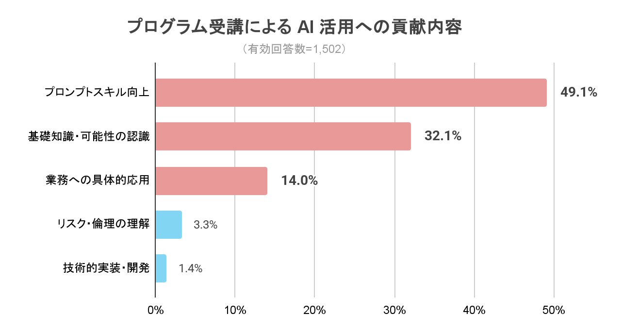 同コンソーシアムが提供している生成AI関連プログラムで学んだ内容がAI活用でどのように役立ったかを聞いたところ、「プロンプトスキル向上」が49.1%と最多。次いで「基礎知識・可能性の認識」が32.1%、「業務への具体的応用」が14.0%となった。