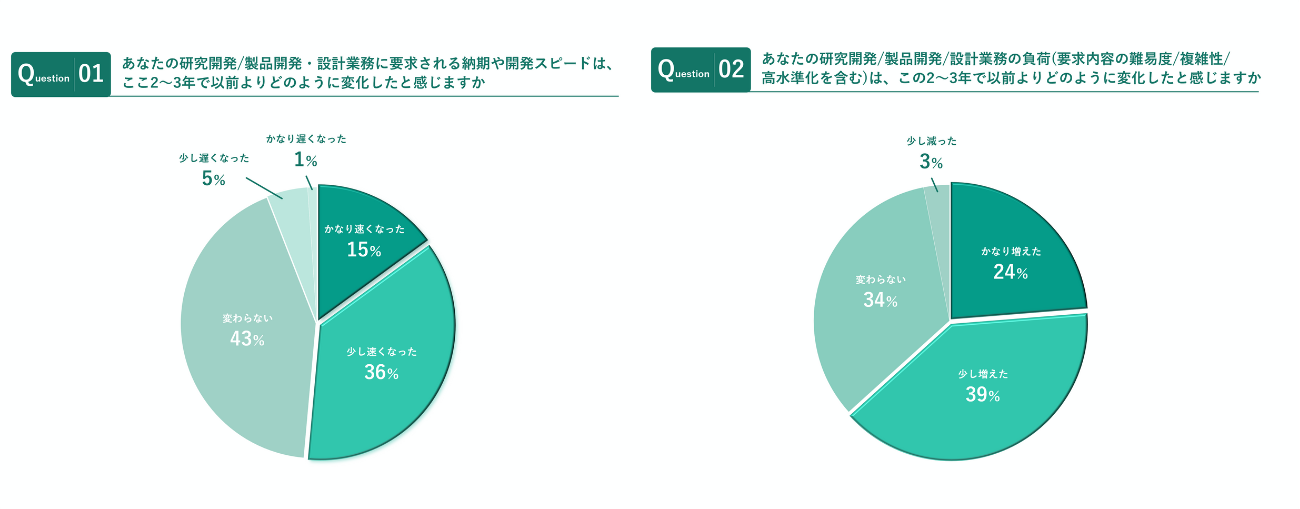この急速な負荷増大の背景には、近年の製造業を取り巻く急激な環境変化があると考えられる。「製品の高度化・複雑化」が進み考慮すべき仕様や検証項目が激増していることに加え、「環境・法規制への対応」が厳格化。さらに「サプライチェーンの変動」で部材変更や再設計が頻発し、AIをはじめとする「技術革新のスピード加速」により情報の陳腐化も早まっている。