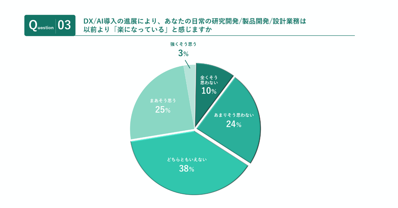 一方で、こうした状況を打開するために各社で進むDXやAI導入の効果では、72%が「業務が楽になった実感がない」と回答。急速に進化する生成AI技術やそれらを活用したデジタルツールの導入が積極化する一方で、複雑に絡み合う情報を「現場が使いこなせる状態」には至っておらず、負荷軽減という成果には結びついていない現状が浮き彫りになった。