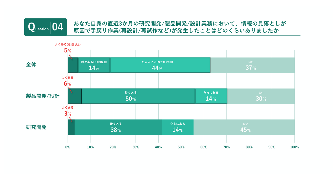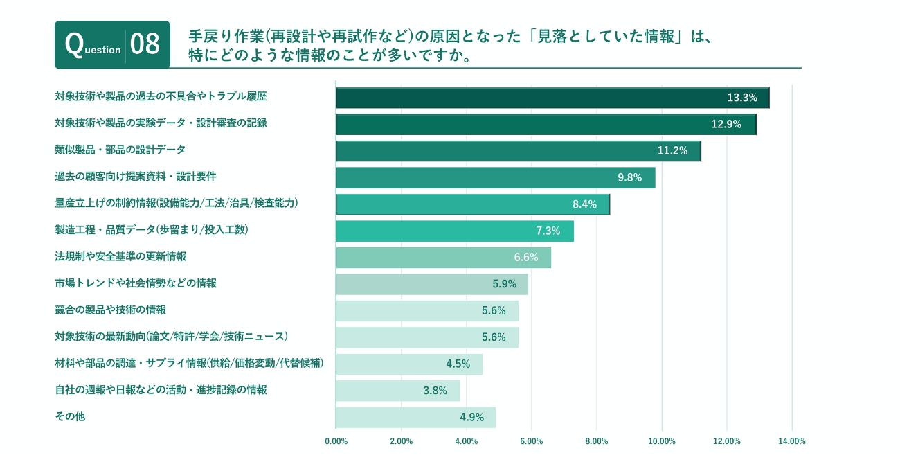 どのような情報の見落としにより手戻りが発生したかについて尋ねたところ、「過去の不具合・トラブル履歴」「実験・設計データの記録」「類似製品・部品の設計データ」といったデータが多数。過去の社内ナレッジが活用できていないことに加え、他部門や外部情報との接続が機能していない実態が明らかになった。