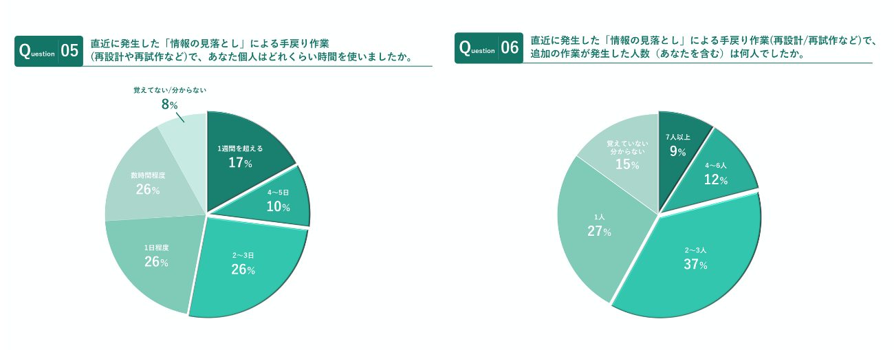 直近で発生した「手戻り」によって生じた作業時間/人数について尋ねたところ、半数を超える53%が「2~3日以上」の作業時間を要している。また、56%が手戻り作業に「2~3人以上」のリソースを割いており、平均すると一度の手戻りによる損害として9人日の工数ロスが発生している実態が明らかになった。