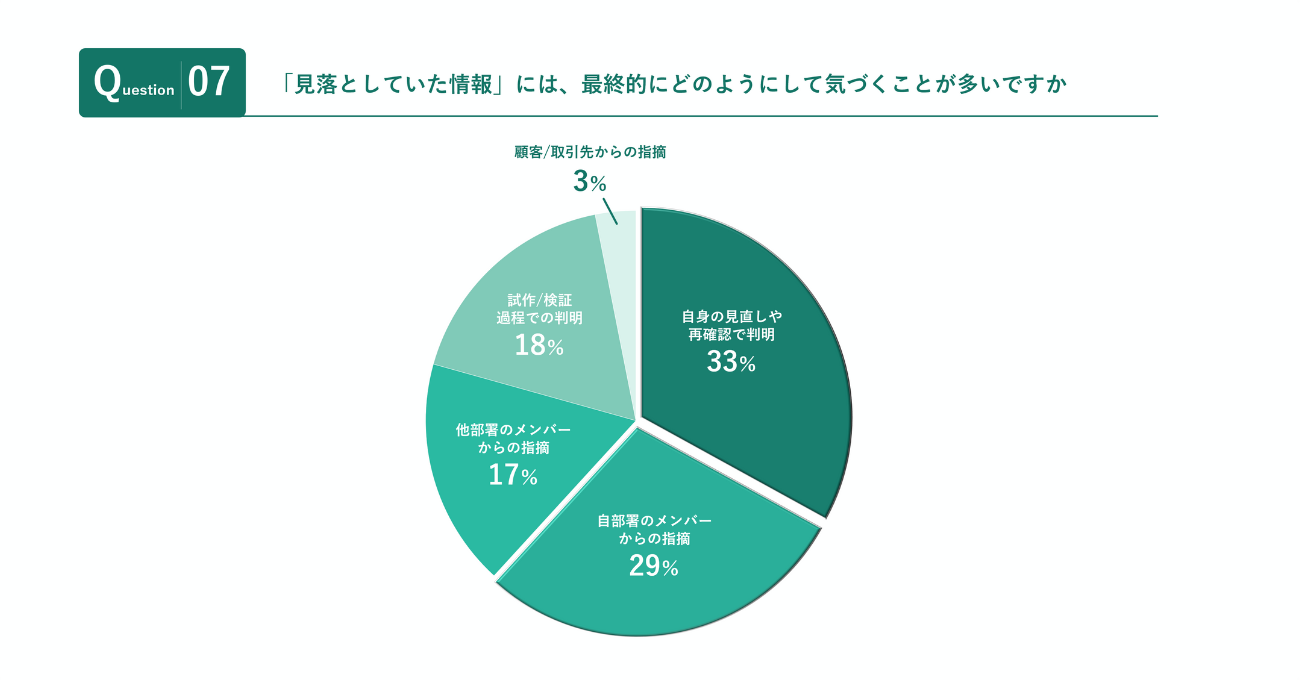 さらに、手戻りの原因となった情報の見落としはどこで発覚したかについて尋ねたところ、自身の見直しによる発覚は33%。約7割が自身の手を離れた第3者による指摘によって発覚していることが明らかになった。