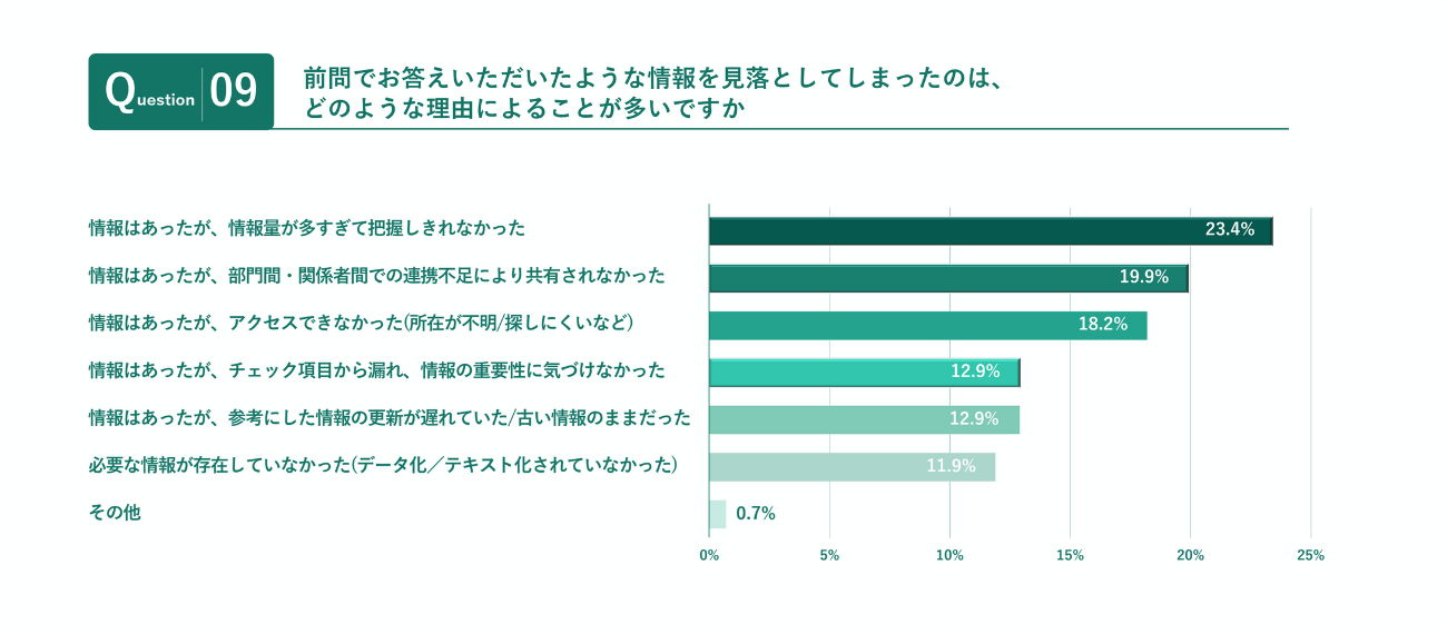 さらに情報を見落としてしまった原因について尋ねたところ、情報自体が存在していないケースは約12%。約75%が情報は存在するが「情報が多すぎて見つけられなかった」「共有/連携されていなかった」など、手戻りの原因となる情報見落としのほとんどが「情報過多」や「活用不全」に起因していることが明らかになった。