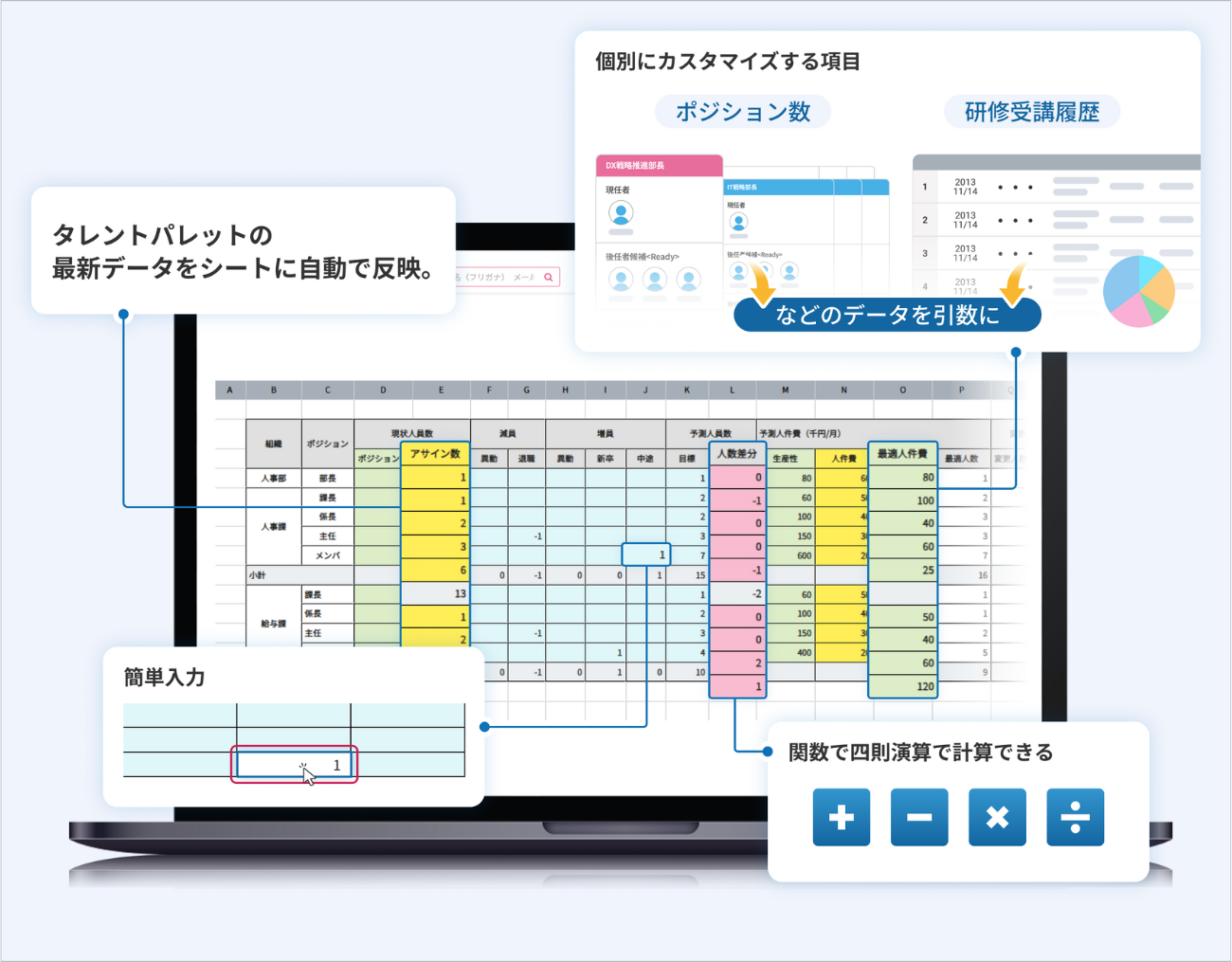 同機能では、企業独自のレイアウトや集計項目に柔軟に対応し、人事データとマーケティング思考に基づく分析機能を組み合わせることで、従来手作業で行っていた要員計画表の作成を大幅に効率化。これにより、作成にかかる工数を大幅に削減するとともに、データ活用による、戦略的な意思決定の高度化を実現する。