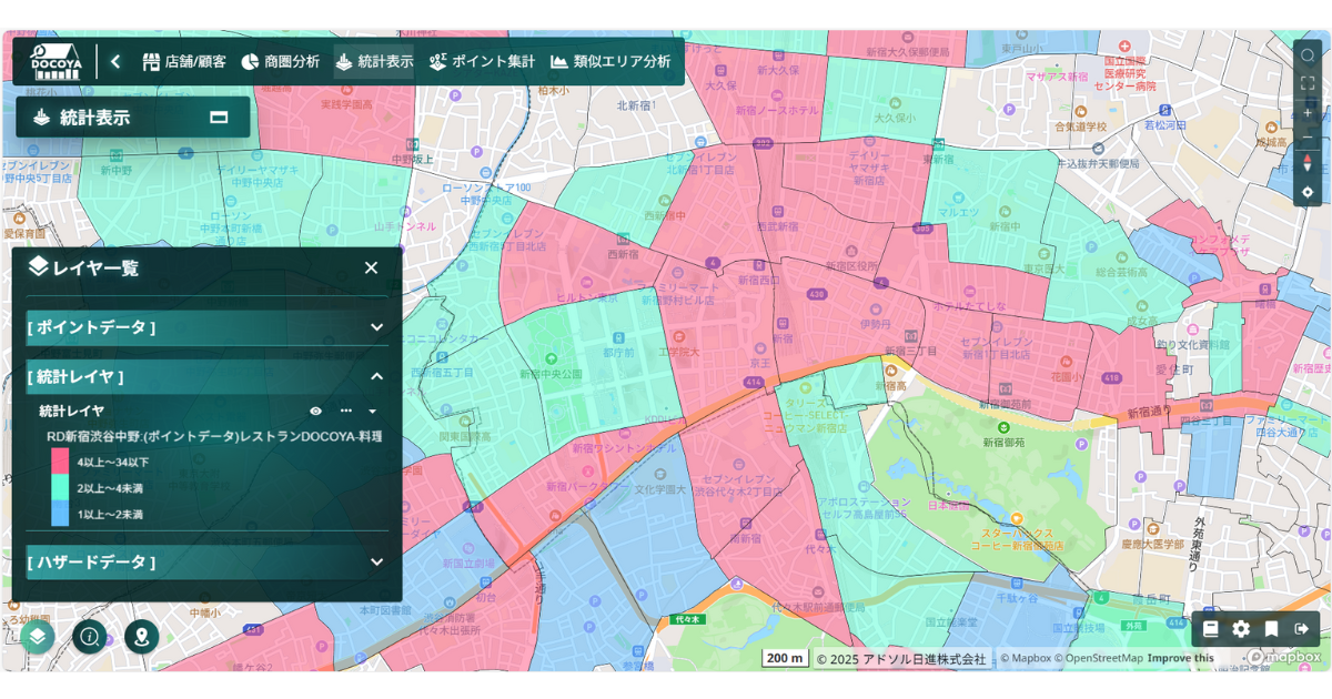 「レストランDOCOYA」は、飲食業界や食品メーカー、サービス業などを対象に「地図」および業界データによるエリア分析を実現するもので、InsiteStreamに収集された多様なデータを効率的かつ直感的にDOCOYAのマップ上で可視化する。例えば、店舗ジャンルごとの分布を地域別に色分け表示することで、出店計画や競合分析、既存店舗の状況把握を支援する。データと地図の一体運用により、経営層や企画担当者のより精度高い意思決定を可能とし、立地・商圏戦略の再現性確保と業務のスピードアップを図ることができる。