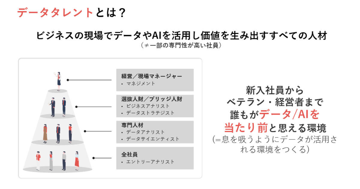ここで鍵となるのが「データタレント」という概念だ。鵜飼氏はこれを、「一部の専門人材に限らず、ビジネスの現場でデータやAIを活用し価値を生み出す全ての人材」と定義した。
