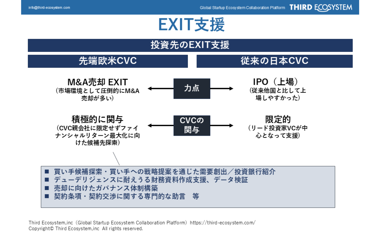 図:【観点3:(EXIT)投資先のEXIT支援】欧米のCVCと日本のCVCの比較(Third Ecosystemによる分析)/クリックすると拡大します