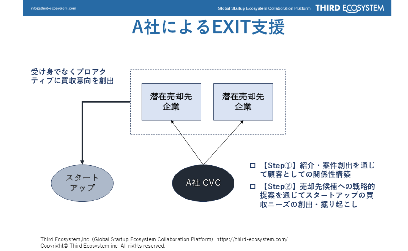 A社CVCは「非戦略投資」を貫いているため、EXITにおいても親会社への売却を前提とせず、ファイナンシャルリターンが最大となる売却先を探索する。受け身ではなく、売却候補企業に対し「自社開発するよりこのスタートアップを買収すべき(Buy vs Build)」といった戦略的提案を行い、買収ニーズ自体を創出する点が特徴だ。加えて、交渉や外部監査への対応なども手厚くサポートする。