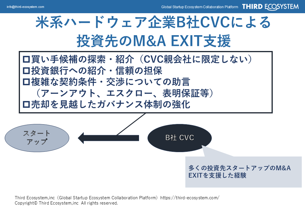 B社CVCも同様に親会社に限定せず、リターン最大化を狙える売却先への支援を行う。顧客候補として関係構築を進めつつ、十分なリターンがあれば親会社の競合への売却にも反対しない。また、豊富なM&A EXIT経験を活かし、アーンアウト[1]などの複雑な契約条件についての助言や、投資銀行への紹介を行ってスタートアップの信用力を補完している。