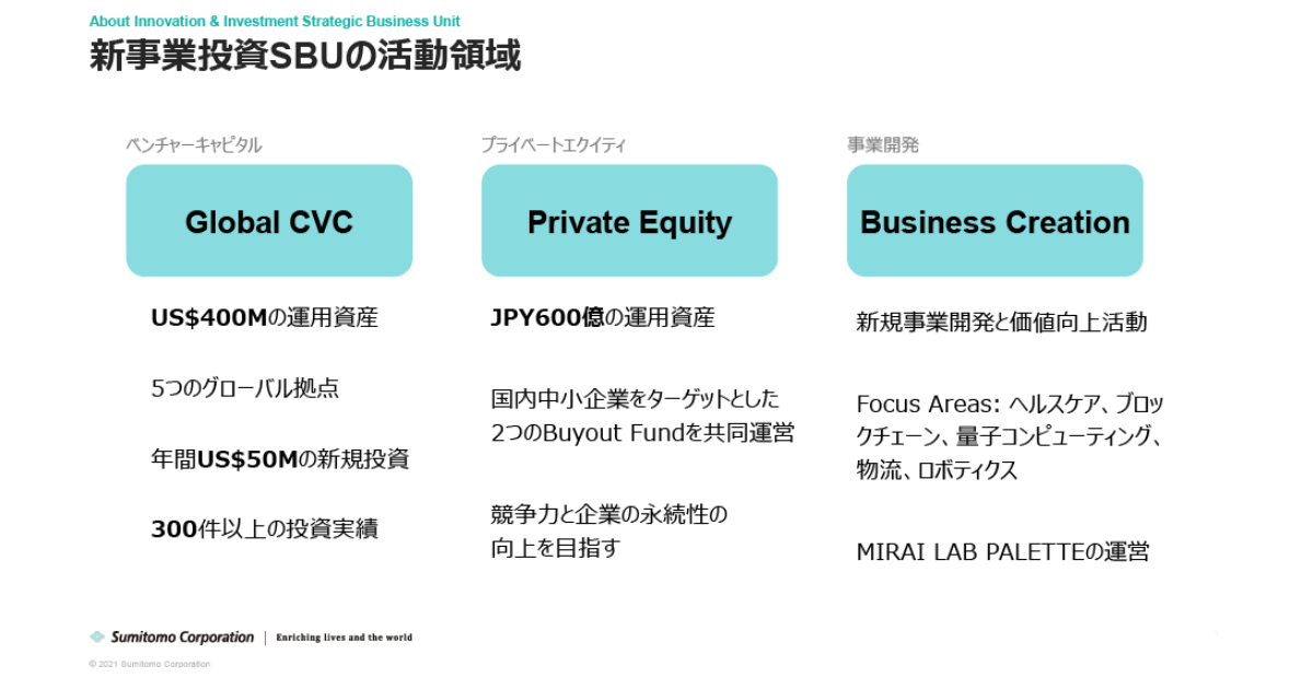 このSBUは大きく3つの役割を担っています。1つ目は私たちが統括する「グローバルCVC」、2つ目がバイアウトファンド投資を行う「プライベートエクイティ」、そして3つ目がそれらの投資先との「事業開発」です。