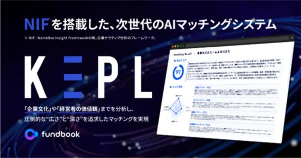 fundbookは、事業・財務データだけでは見えない企業文化や経営者の価値観まで解析し、最適なパートナー選定を実現するAIマッチングシステム「KEPL(ケプル)」を2026年1月下旬より提供開始する。