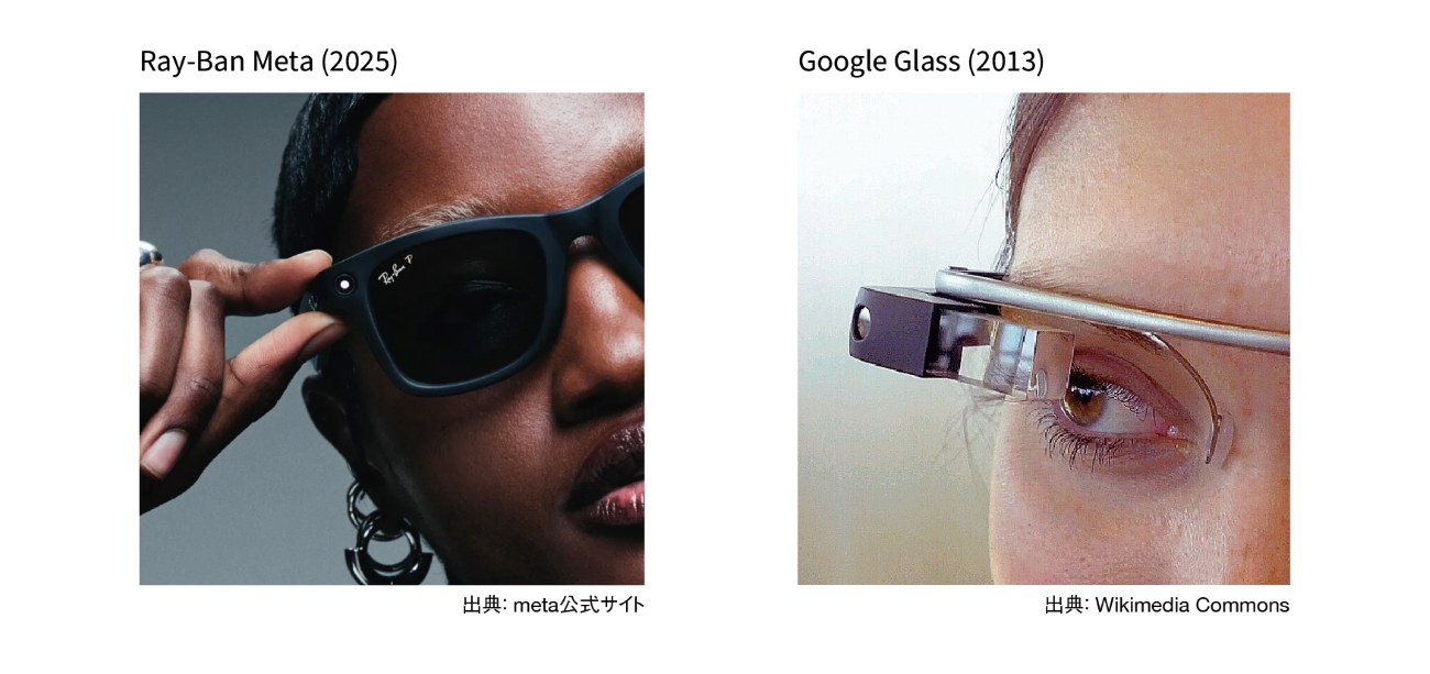 そのことを、Google社が開発した「Google Glass」と、Meta社とEssilorLuxottica社が共同開発した「Ray-Ban Meta」という2つのスマートグラスのデザインを例に見てみましょう。
