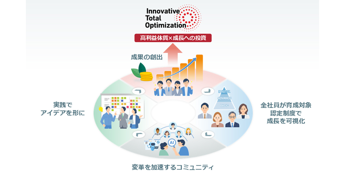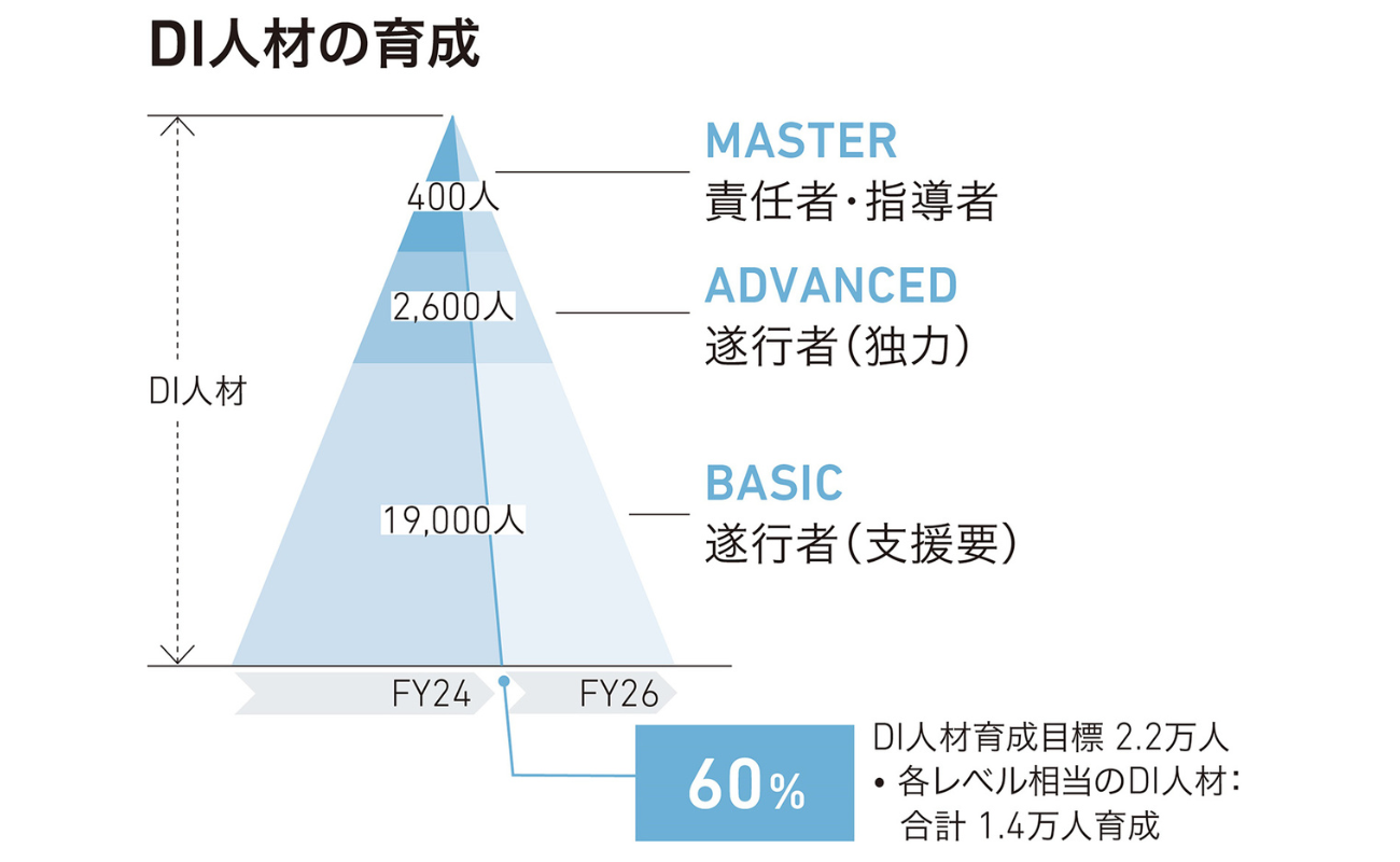 同グループは、「全体最適」と「領域拡大」を二本柱とする経営方針「Innovative Total Optimization(ITO)」の実現に向けて、DX(デジタルトランスフォーメーション)推進を重要な戦略課題として位置付けている。競争力強化と持続的成長のため、国内外約300社から成るグループ全社員—一般社員から経営幹部まで—を対象に、体系的なDI人材育成プログラムを展開する。