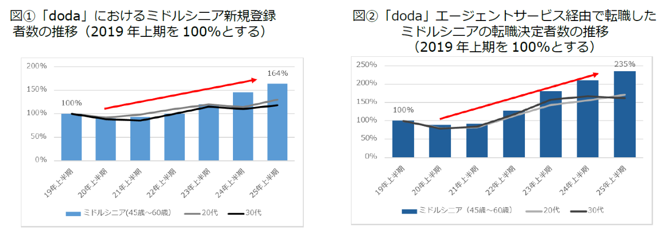 「2025年 ミドルシニアの転職市場予測レポート」では、主に役職定年や定年を目前にした50代が本格的に転職に動き出す「ミドルシニア元年」になると予測した。2025年上期時点でdodaに新規登録したミドルシニアは2019年同期比の164%に増加。登録者数は2020年上期以降5年連続増加した(図1)。また、転職決定者数では2019年同期比で約2倍に拡大。2020年上期以降5年連続で増加している(図2)。