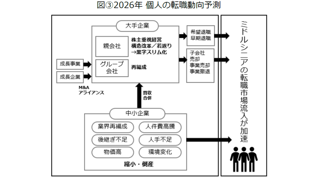 個人の転職動向予測:2026年は大手企業の構造改革や中小企業の合併などをきっかけにより多くのミドルシニア人材が転職市場へ