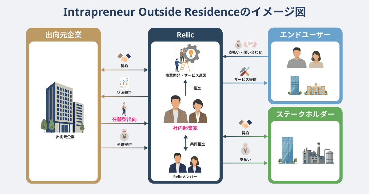 事業共創を手がけるRelicは、2025年12月25日より新規事業創出に特化した在籍型出向サービス「Intrapreneur Outside Residence(IOR)」の提供を始めた。本サービスは、大企業に所属する社内起業家がRelicへ出向し、事業開発に特化した環境で自身のアイデアを事業化することを支援する。