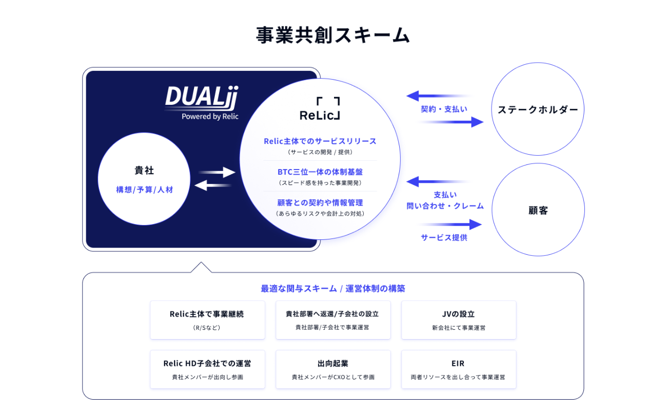 IORの利用者は、Relicに在籍しながら事業責任者として意思決定・推進を担い、「DUALii」を通じてRelic名義で事業をリリース。ビジネス・テクノロジー・クリエイティブが一体となった組織が専門的に支援することで、スタートアップ水準のスピードで事業開発を行う。契約は在籍型出向で、出向元企業との雇用契約を維持したままRelicと出向契約を締結し、給与もRelicから支給され、費用構造の透明性と企業側の負担最適化を図る。