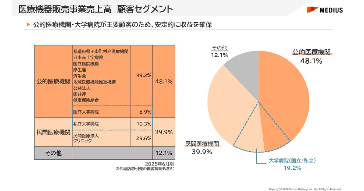 芥川浩之氏(以下、芥川):メディアスグループの業態を一言で言えば、国内外のメーカーから仕入れた医療機器や消耗品を病院などの医療機関へ供給し、メンテナンスまでを担う「医療機器総合商社グループ」です。主要な顧客層は、公的医療機関や国立・私立の大学病院であり、売上の約67%をこれら安定した経営基盤を持つ機関が占めています。