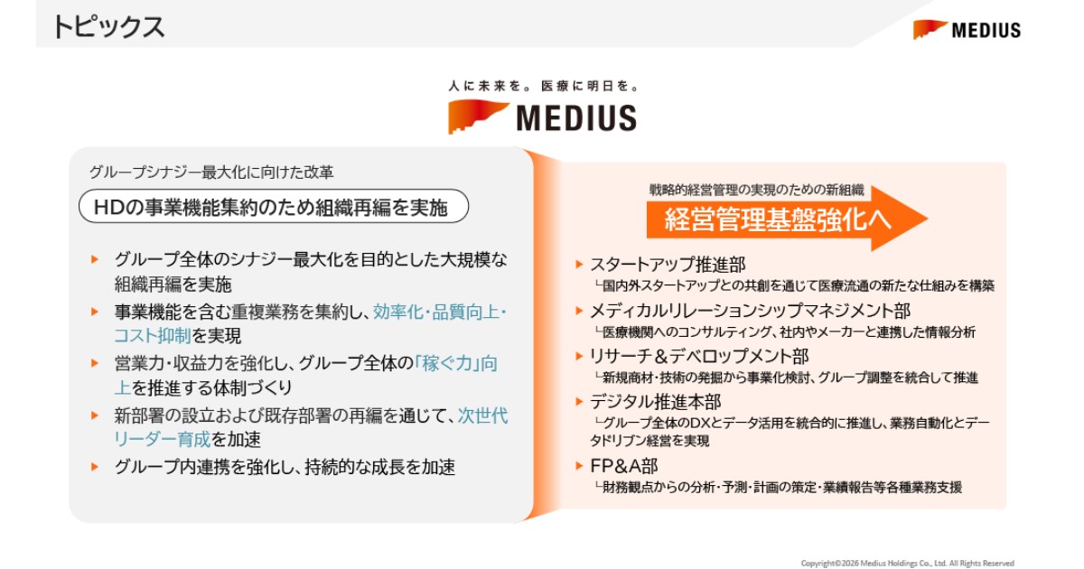 また、直近では物流機能に特化した「メディリスロジ社」を分社化し、「サンメディックス社」との共同配送実験を開始するなど、物流クライシスへの対応も加速させています。さらに、北海道での2社統合による事業基盤強化や、長野県の「共栄医科器械」との経営統合に向けた基本合意など、地域医療を守るためのM&Aとアライアンスも着実に実行しています。