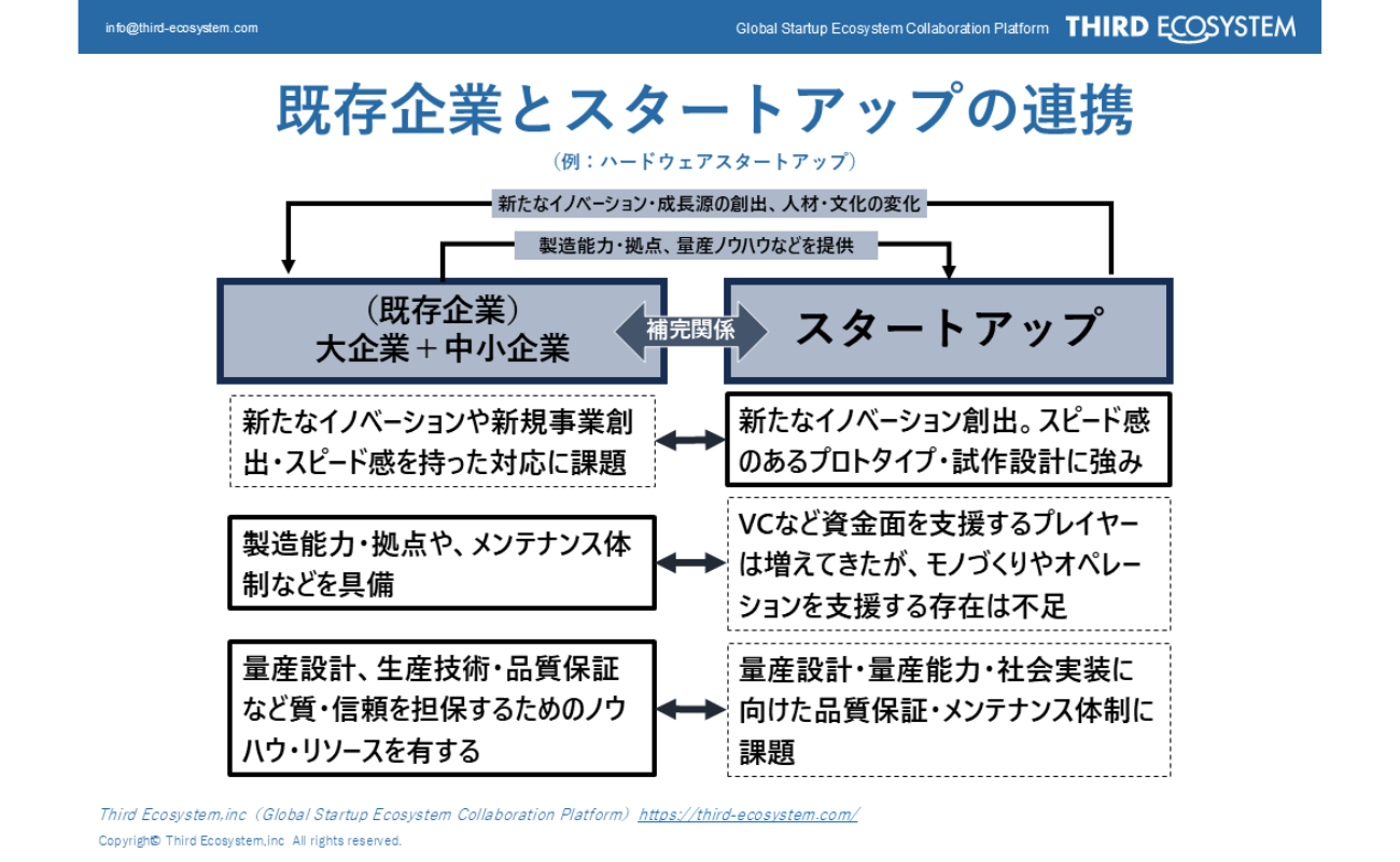 両者の関係は相互補完的だ。スタートアップはイノベーション創出や迅速な試作に長ける反面、量産設計や品質保証、保守体制などの「モノづくり」や「オペレーション」に課題を抱え、資金支援だけでは成長が難しい。一方で既存企業は、製造拠点や生産技術など、質と信頼を担保する豊富なリソースを持つ。既存企業がこれらの「資産(アセット)」を提供することで、スタートアップの成長を加速させ、日本全体のエコシステム活性化に繋がる。