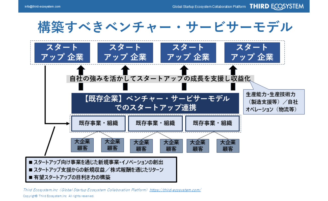 日本の既存企業が培った「現場ノウハウ」や「オペレーション」は、世界に誇る競争力の源泉となる。これらの適用範囲を自社製品に絞り込まず、スタートアップに開放して「ベンチャー・サービサー」の役割を担うことこそが、日本独自のエコシステム成功の鍵となる。