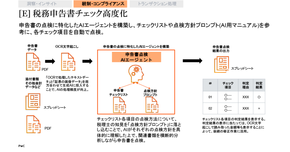 では、具体的に経理・税務の現場はどう変わるのか。PwCのAIエージェントのラピッドプロトタイピングを専業で担う開発組織「AI Factory」のメンバーも務める角谷亮太氏は、実際のユースケースとして「税務申告書チェック高度化」の事例を紹介した。