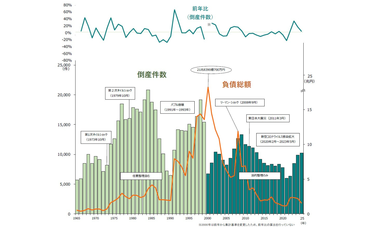 帝国データバンクは2026年1月13日、2025年の全国企業倒産(負債1,000万円以上、法的整理)の集計・分析結果を公表した。2025年の倒産件数は1万261件となり、前年(9,901件)から3.6%増加し、2013年以来12年ぶりに年1万件を超えた。上場企業の倒産はオルツ(東証グロース)の1社のみだった。