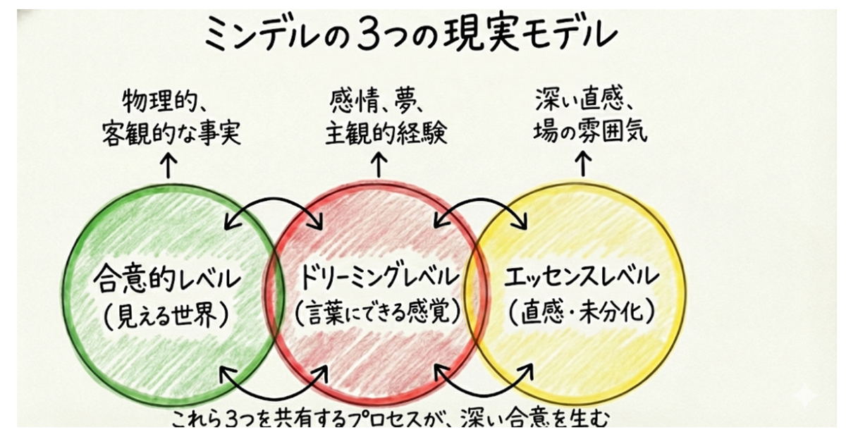 アーノルド・ミンデル博士の3つの現実レベルという「非言語アプローチ」を参照し、根岸氏が図版作成/クリックすると拡大します