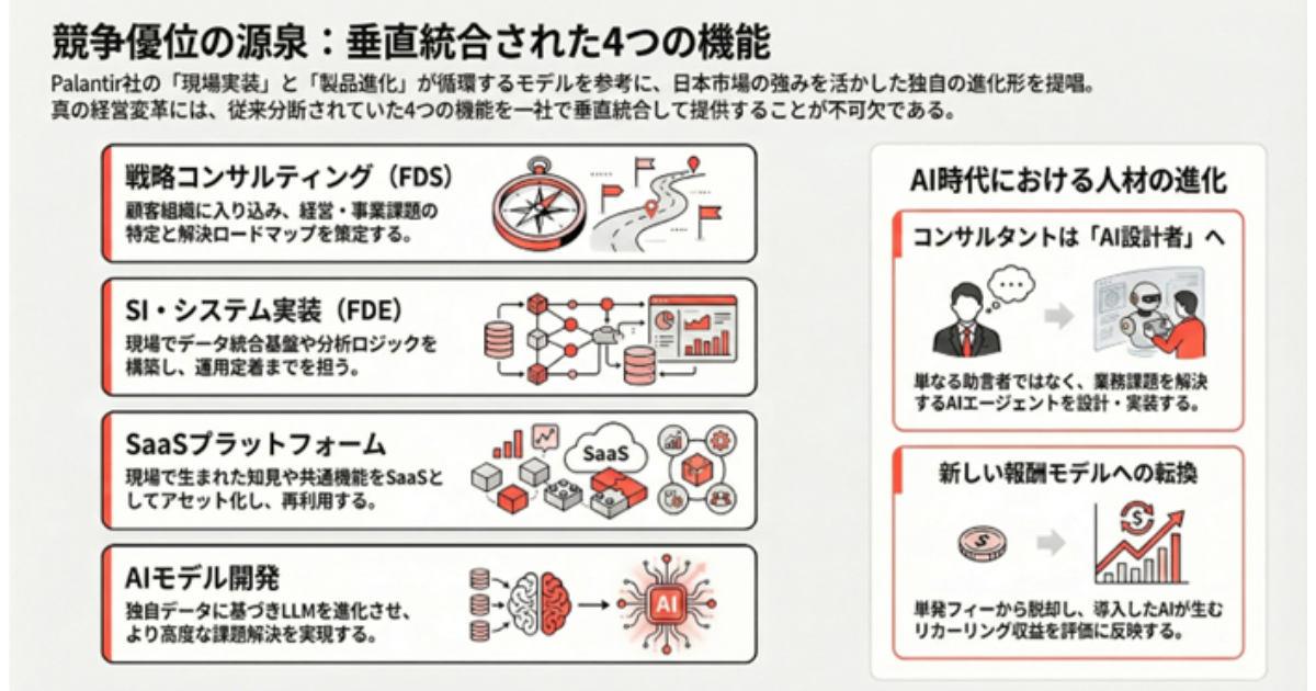 今回の提携を通じて両社は、米国Palantir Technologiesが確立した「Forward Deployed Engineering(FDE)」モデルを日本市場向けに発展させ、単なる戦略と技術の役割分担を超えた一体的なサービス提供体制を築く。Logos&Pathos Consulting主導の「Forward Deployed Strategist(FDS)」が経営層やR&D部門と連携し、経営課題の本質的な特定と成果管理を行う。加えて、ストックマークのエンジニアがFDEとして、国産LLMやAIプラットフォームを顧客固有の環境に即応でカスタマイズし、実装・定着まで支援する。これにより、現場の声を反映したシステム調整と戦略精度の向上を実現し、PoC(概念実証)を越えた実務活用を目指す。