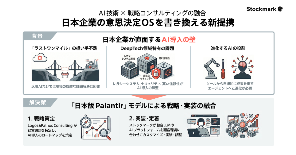 2026年1月15日、ストックマークは戦略コンサルティングファームであるLogos&Pathos Consultingと業務提携を開始した。この提携は、ストックマークが持つ国産大規模言語モデル(LLM)などの最先端AI技術と、Logos&Pathos Consultingの戦略策定および実行力を融合し、日本企業の製造業やR&DなどのDeep Tech領域における課題解決と意思決定プロセスの変革を目指すものである。