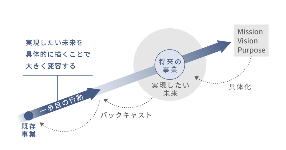 具体的な実施プロセスは、社会や生活者の変化、技術動向を踏まえた未来への問い立てから始まる。参加者の対話を通じて将来像を具体化し、組織で共有可能な言葉に整理する。それらの言語化された未来像をもとに、現状の事業や組織のあり方を見直し、今後取り組むべきテーマや方向性を明確化する。構想と現実を往復する形で合意形成を図り、次のアクションへつなげる。