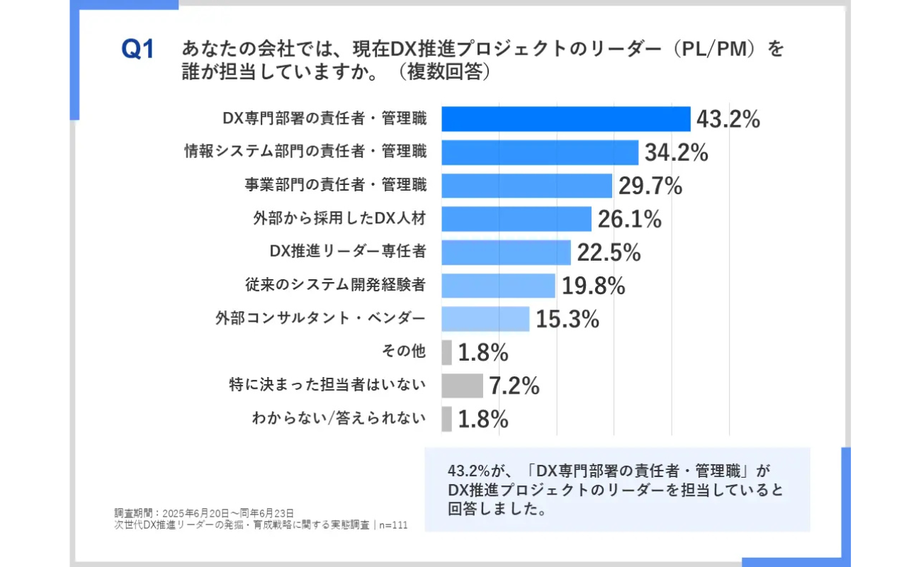 調査では、まず、DX推進プロジェクトのリーダーがどの部門によって担当されているのか明らかにしている。その結果、「DX専門部署の責任者・管理職」が43.2%、「情報システム部門の責任者・管理職」が34.2%、「事業部門の責任者・管理職」が29.7%であり、複数の部門でリーダーが選出されている実態が見られた。